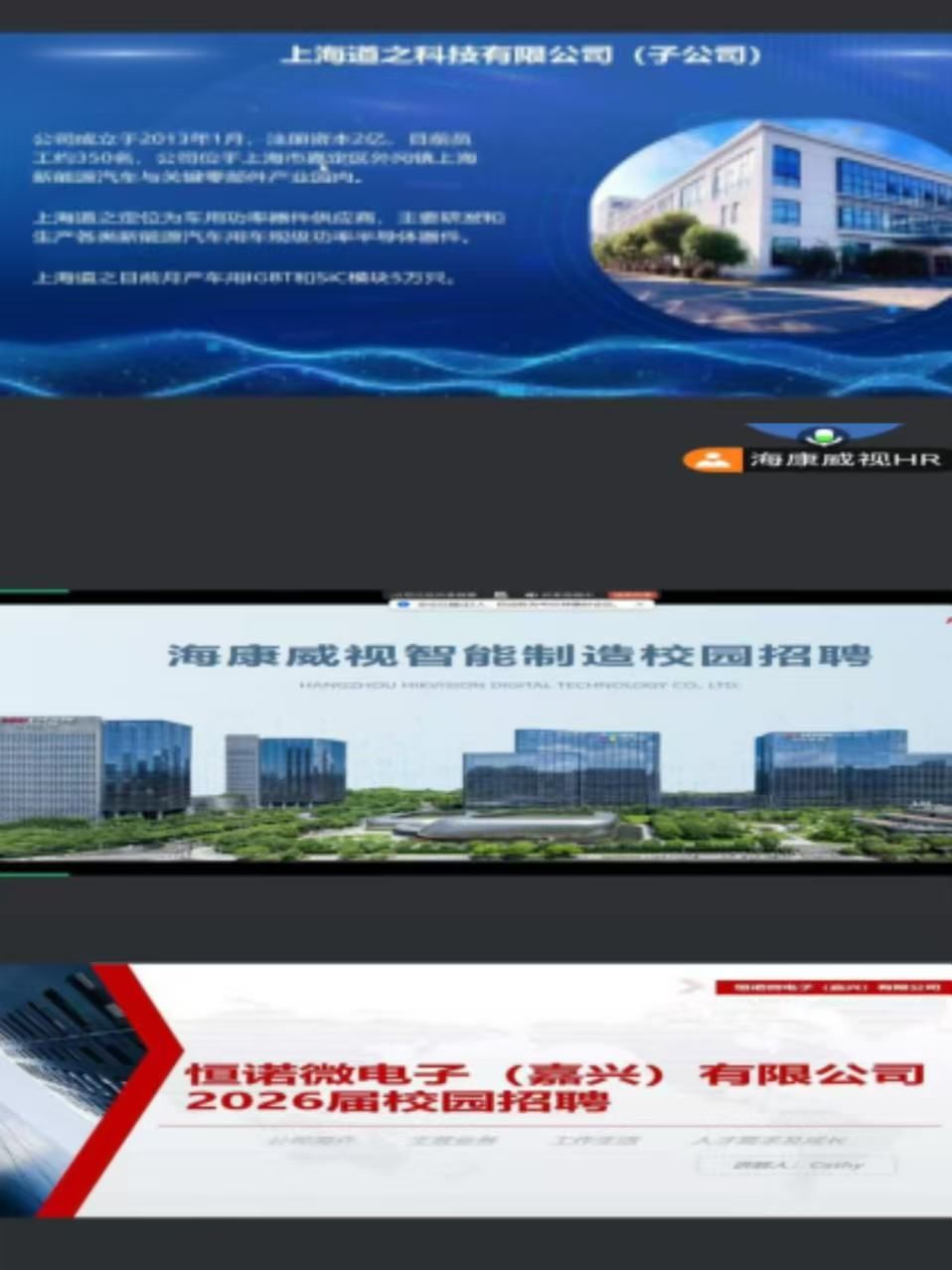 为扎实推进毕业生就业工作,2月22日,电子信息学院举办线上专场招聘会。上海道之科技有限公司、恒诺微电子(嘉兴)有限公司、海康威视智能制造有限公司三家用人单位受邀参加,学院2026届未就业学生及部分2027届学生在线参会。