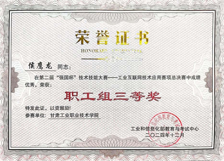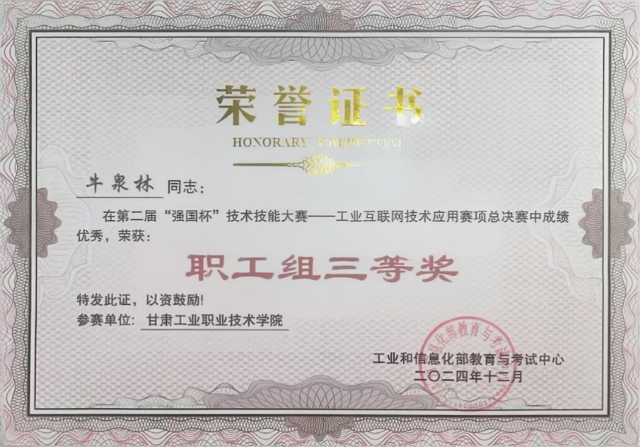 2024年12月,工业和信息化部教育考试中心主办的第二届“强国杯”技术技能大赛在山东烟台职业学院举行,我校电子信息学院相关专业教师牛泉林、侯鹰龙参加工业互联网技术应用赛项的比赛,并获得职工组三等奖。